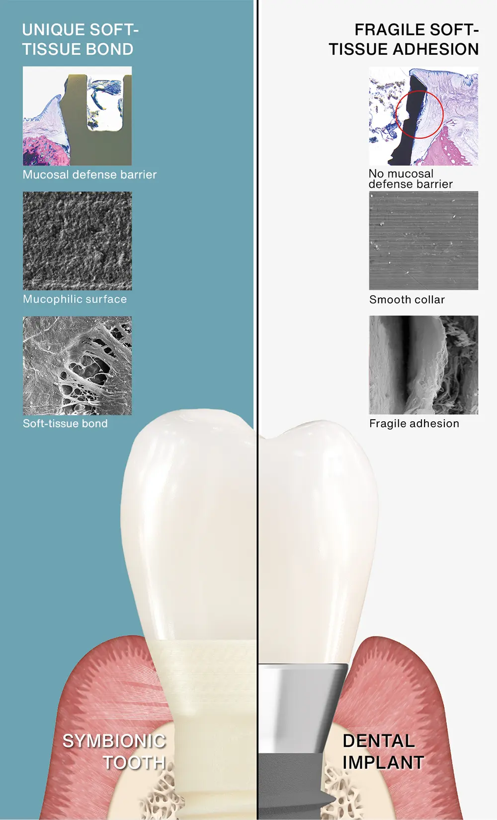 When a tooth is lost, the surrounding soft-tissue barrier is destroyed - a protection that dental implants can never restore. Without this barrier, plaque and bacteria easily penetrate deep into the tissues, triggering inflammation of both soft tissue and bone.