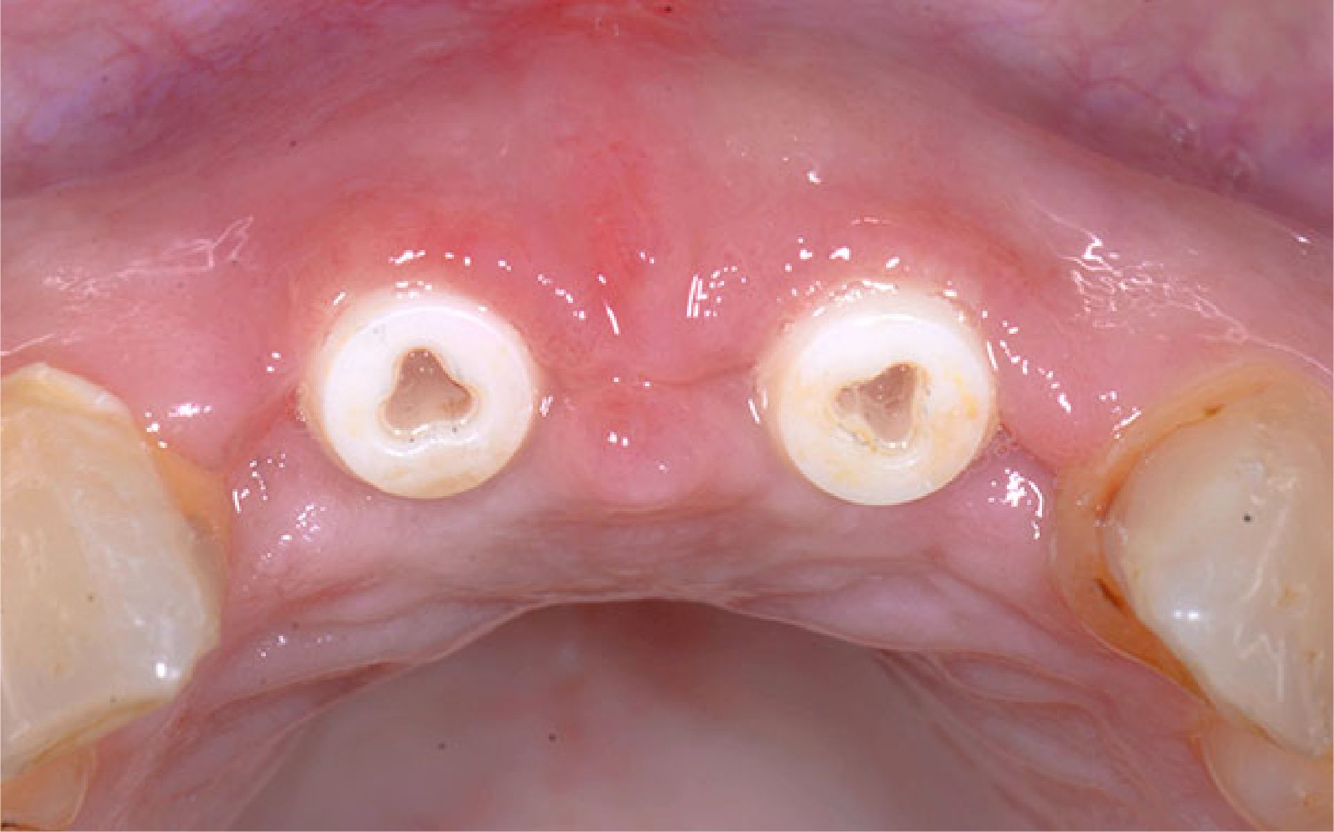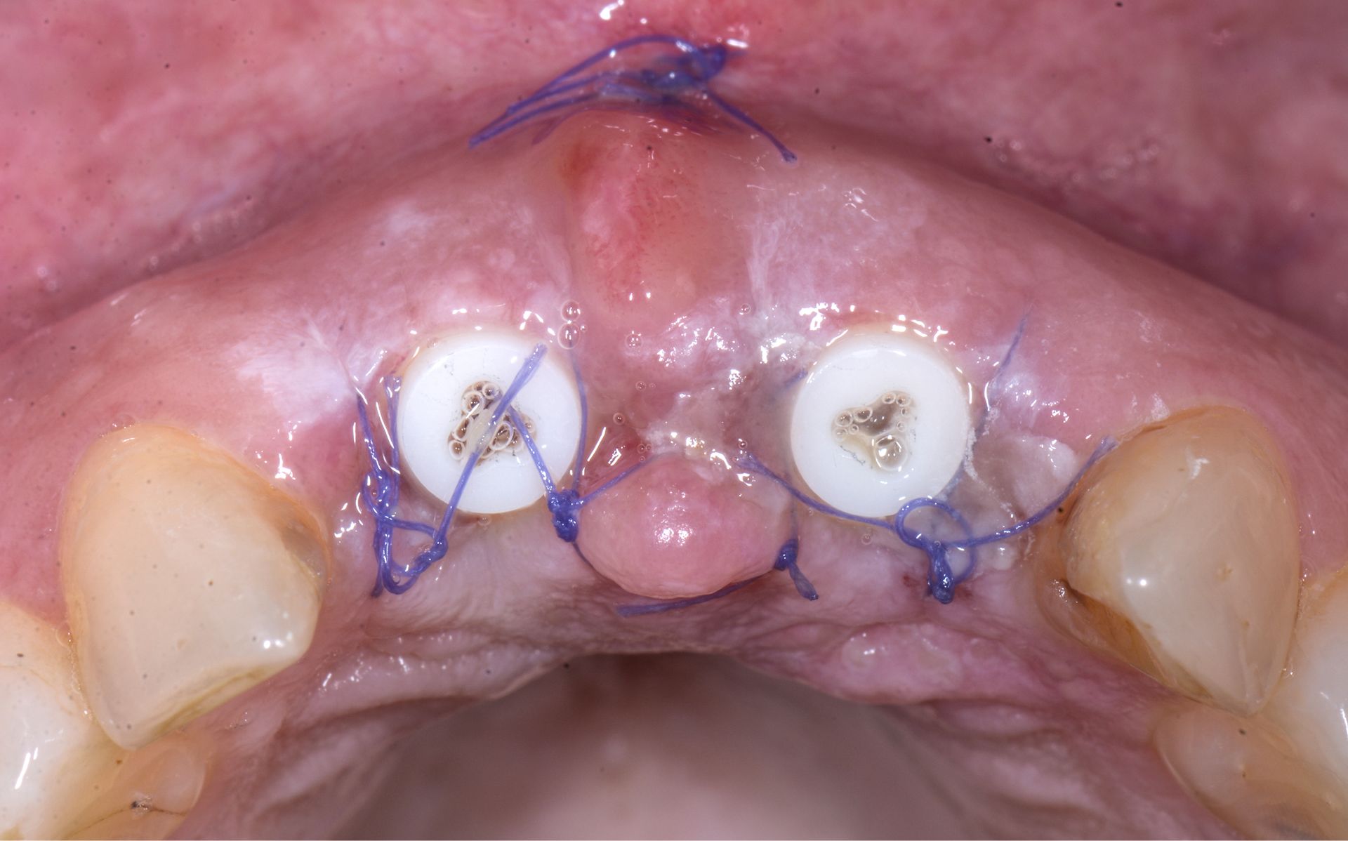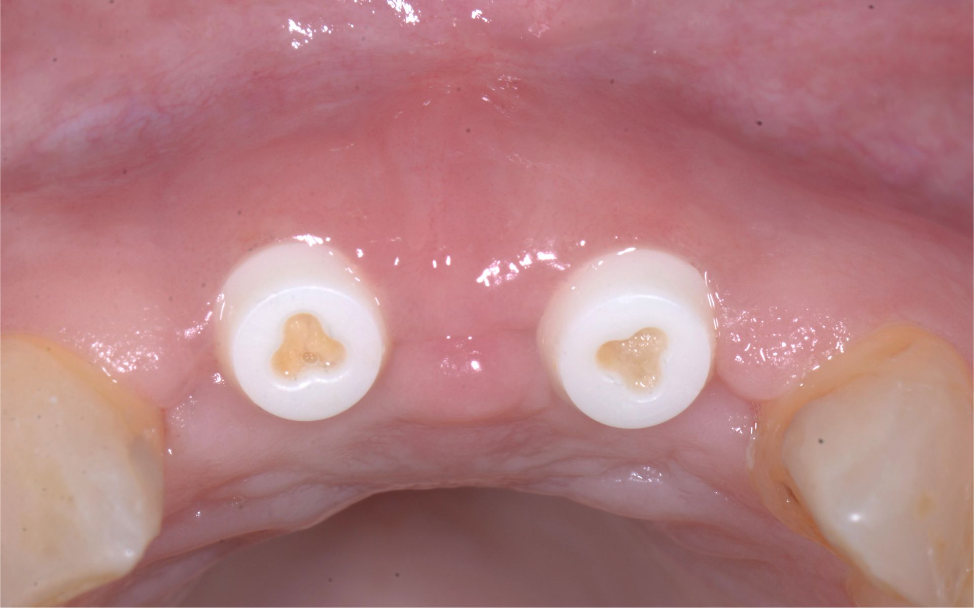 Failing restorations of teeth 11 and 21 were removed and the tooth roots extracted. Two symbionic teeth were immediately placed and later restored with single crowns.
