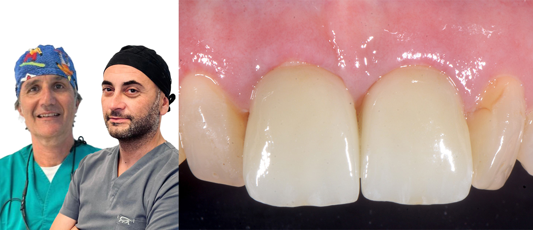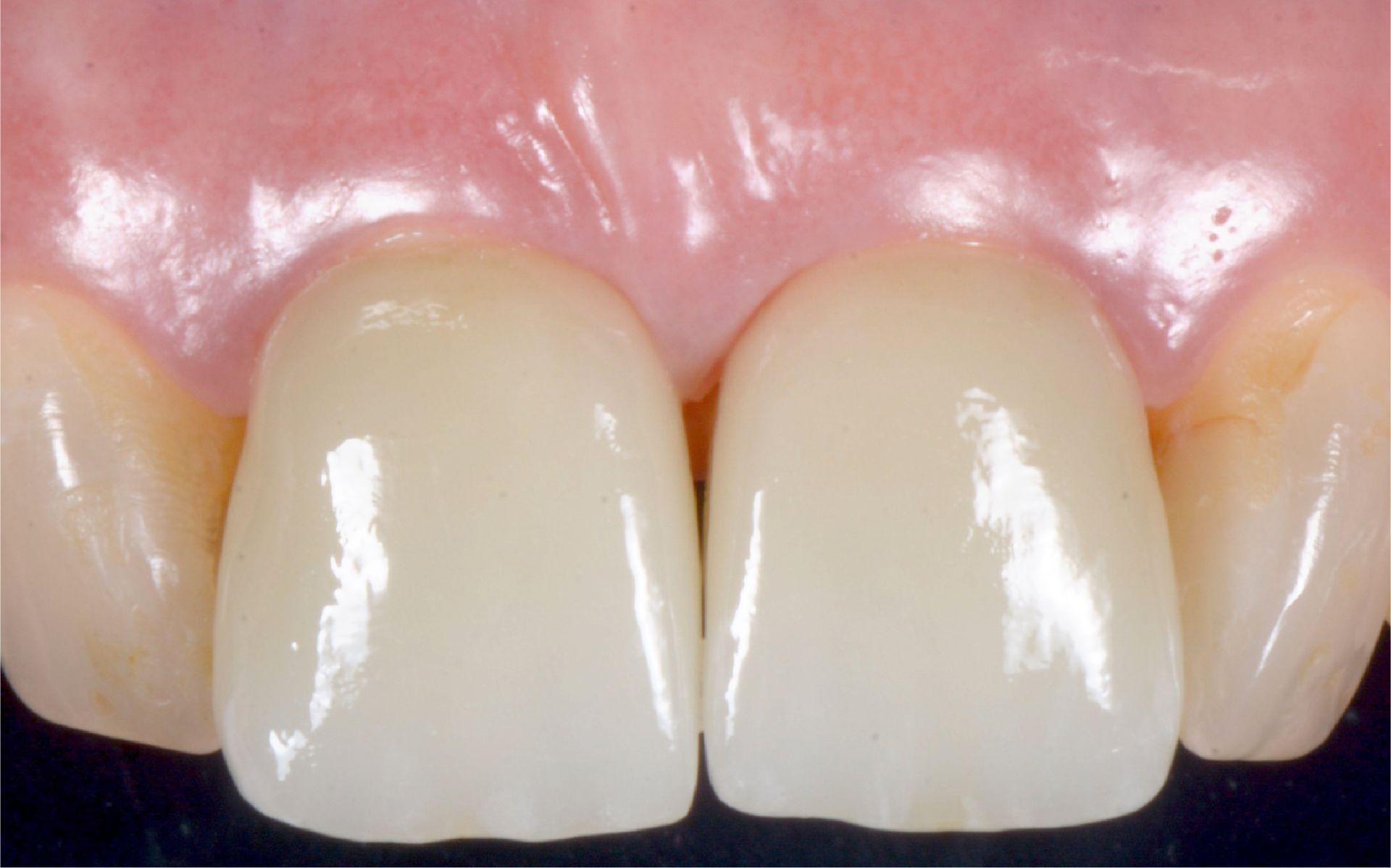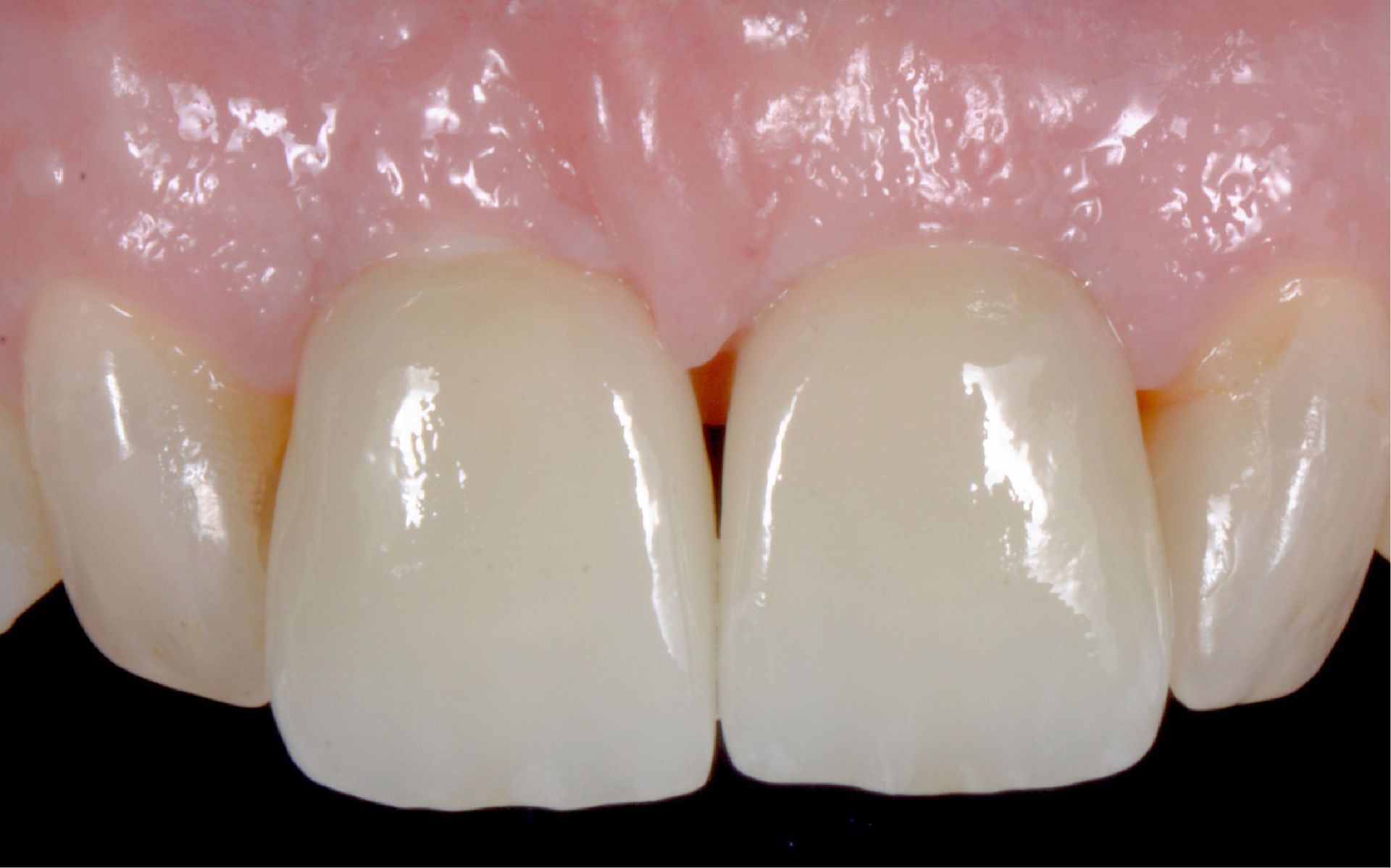 Failing restorations of teeth 11 and 21 were removed and the tooth roots extracted. Two symbionic teeth were immediately placed and later restored with single crowns.