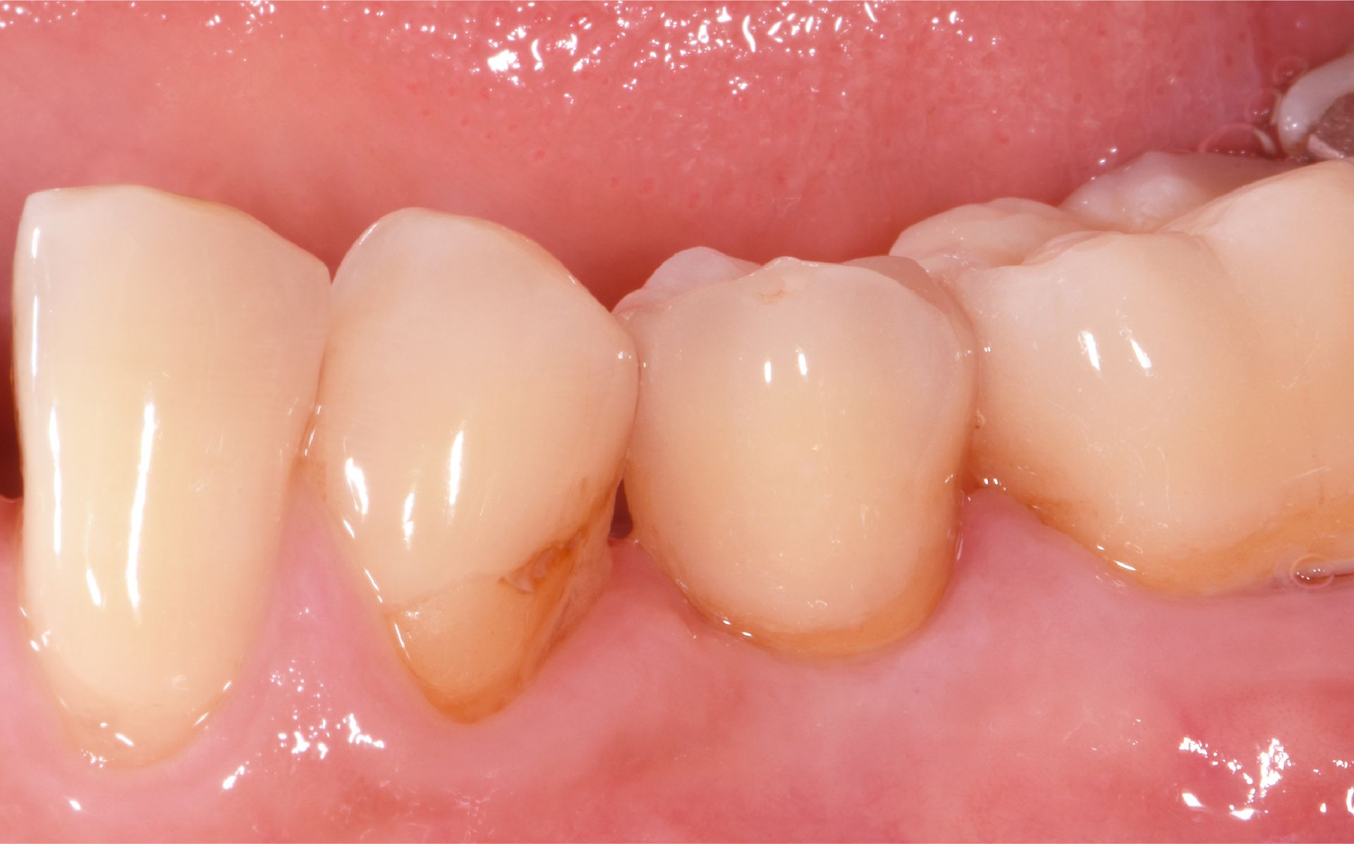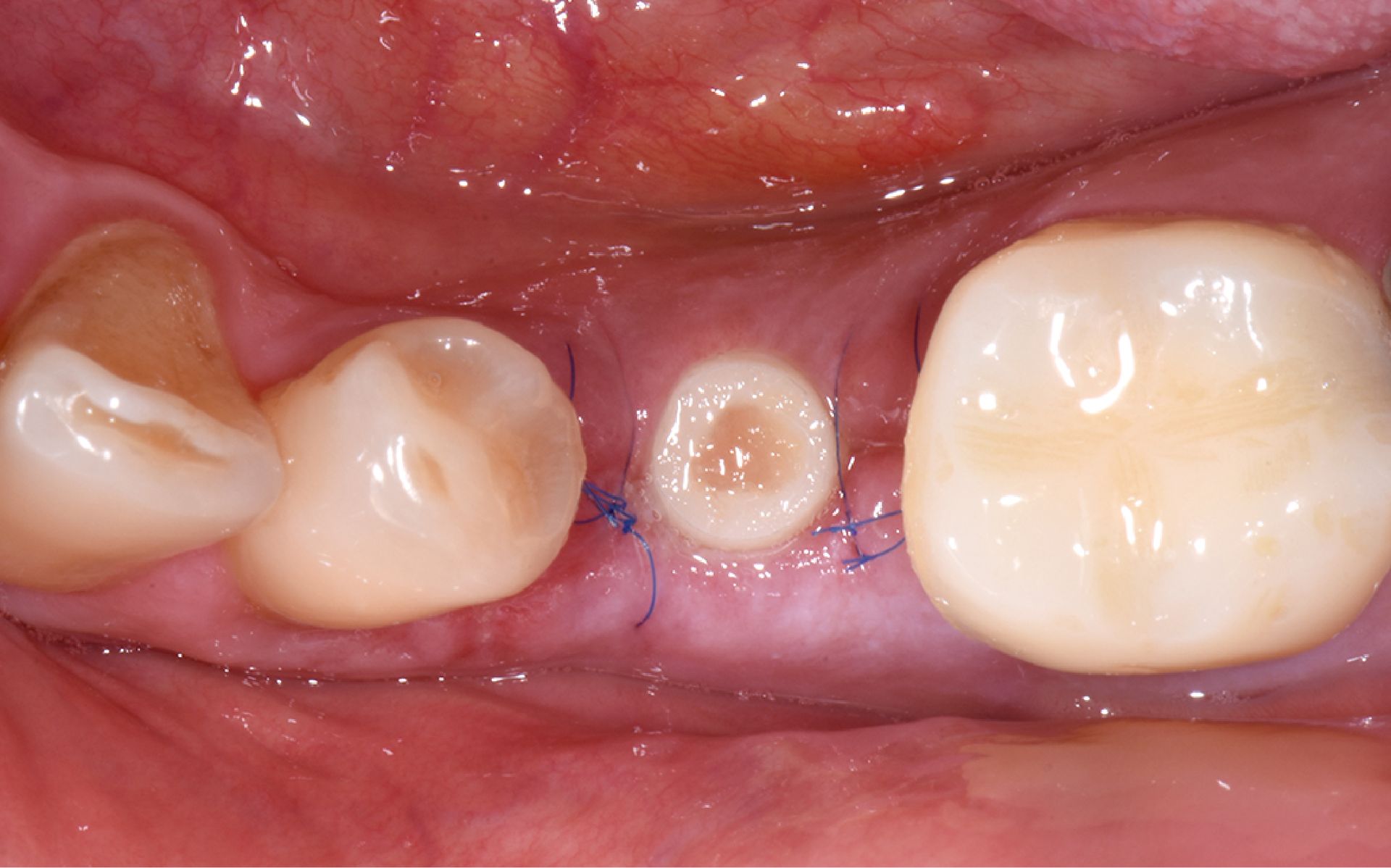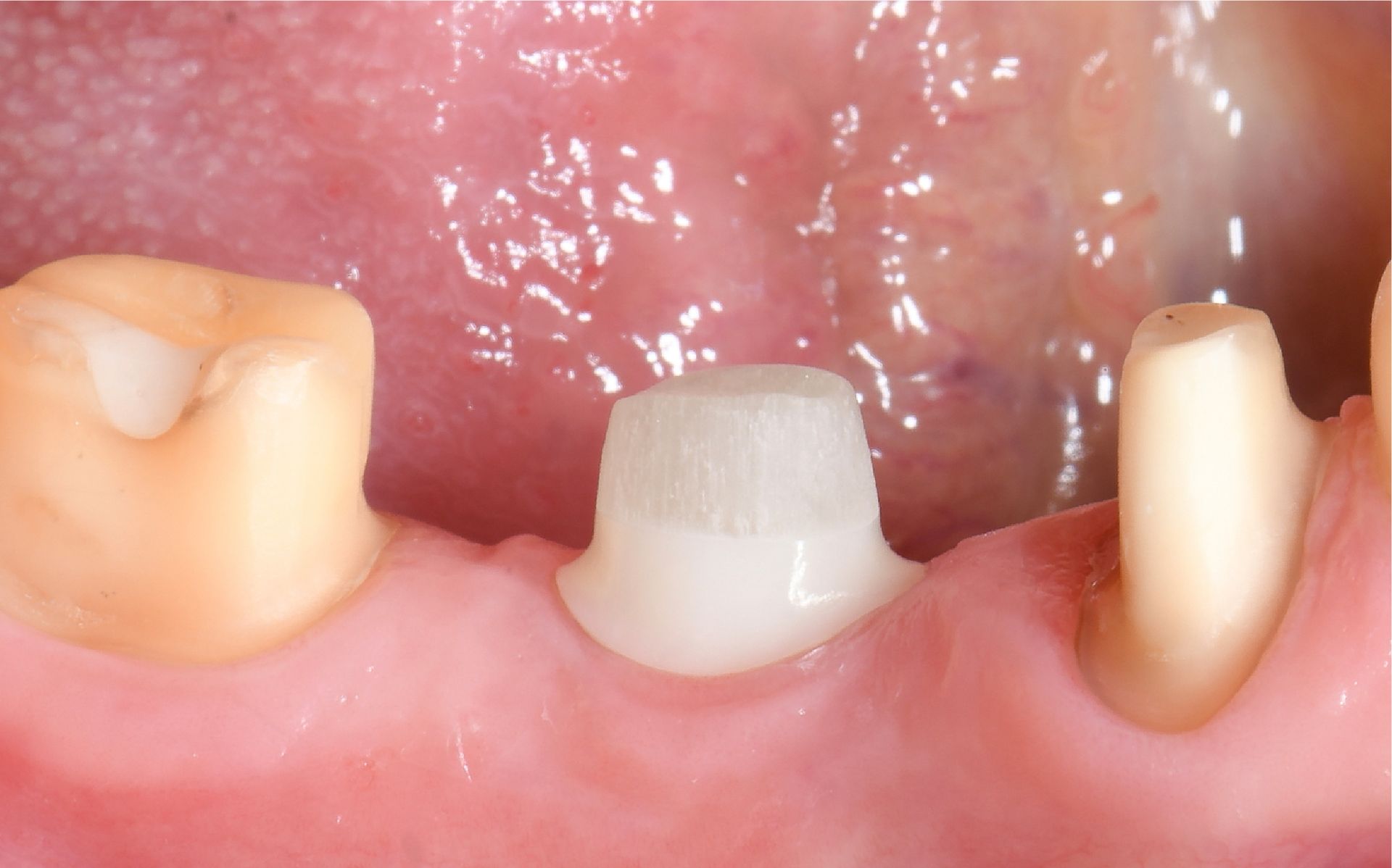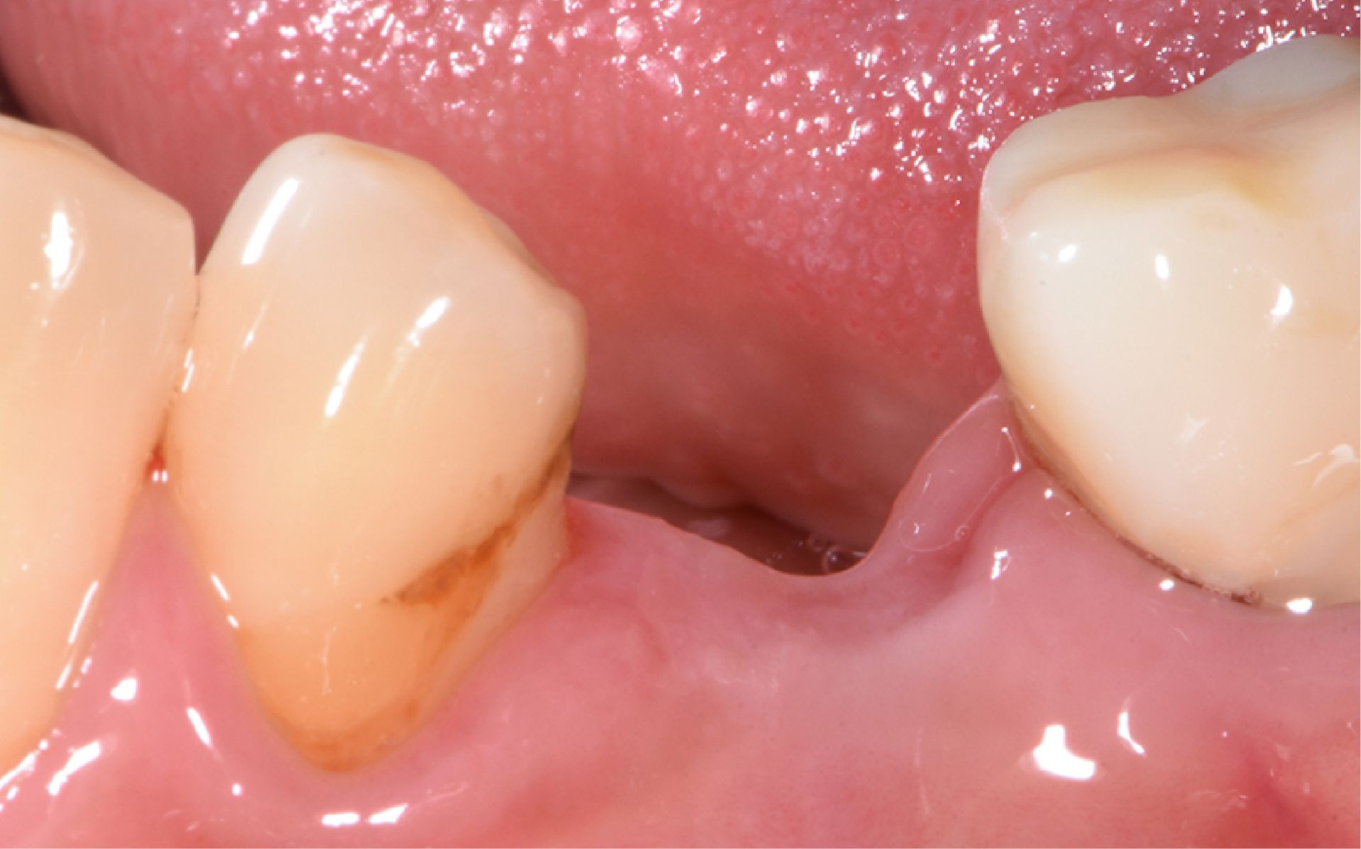 Tooth gap in region #35 following extraction elsewhere due to deep caries and acute pulpitis. The patient presented to the author’s practice eight weeks later requesting a fixed restoration. Slight horizontal ridge collapse. Soft-tissue thickness: 3 mm. Caries on adjacent crowned tooth #36.
