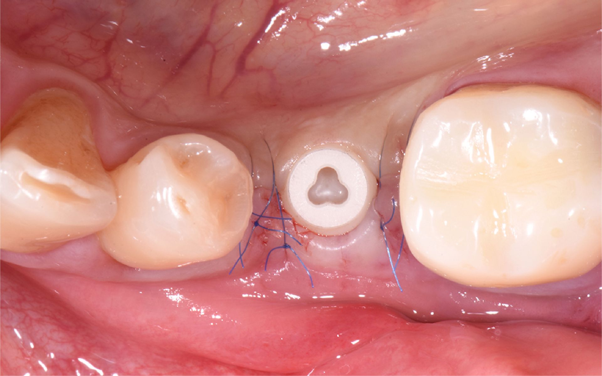 Vestibular incisions were made in regions #11 and #21. The old restorations were removed, and the tooth roots were extracted. The alveoli were curetted. A surgical guide was placed, and osteotomies were prepared according to the manufacturer’s protocol for D3 bone at 600 RPM. Symbionic Teeth were