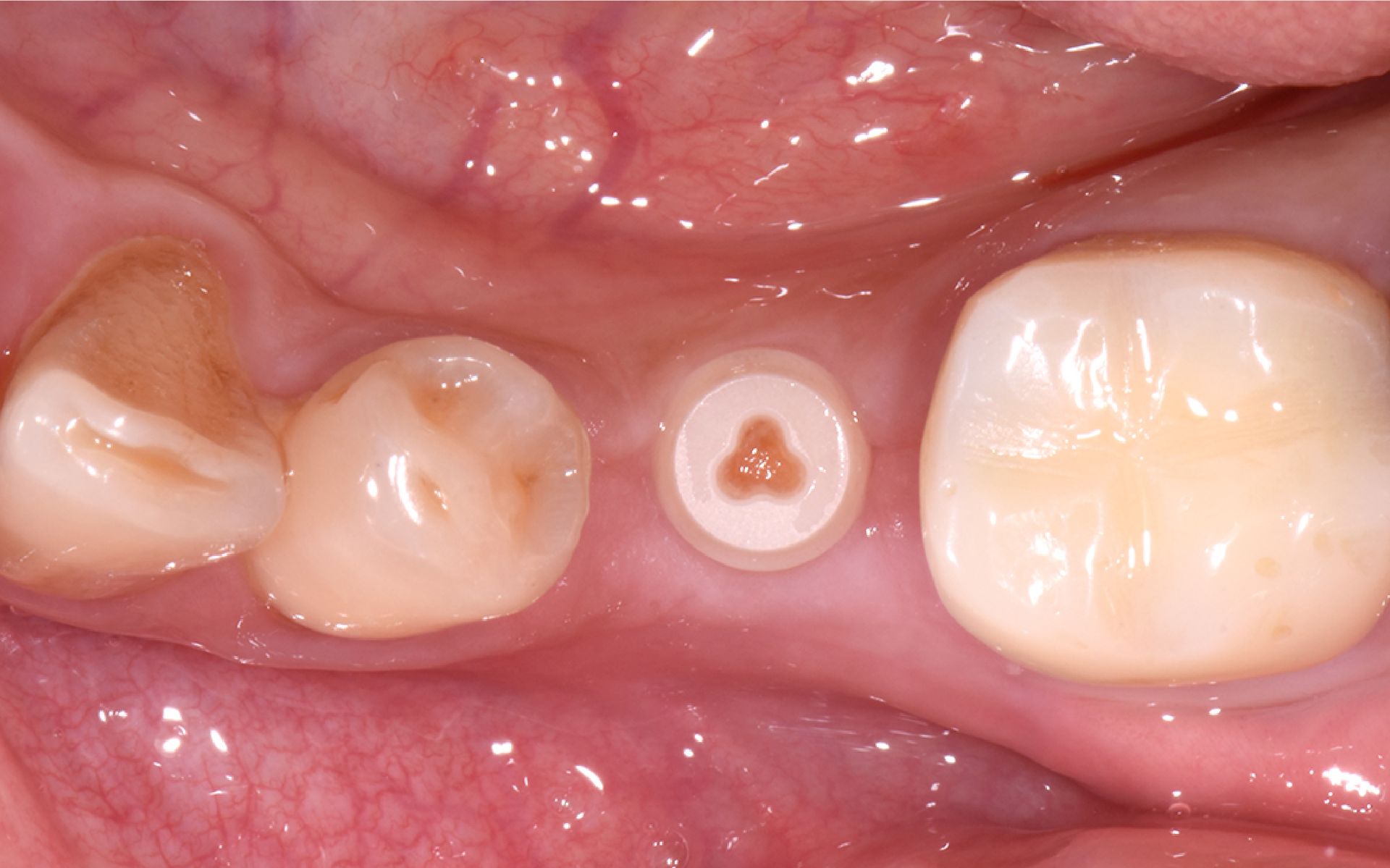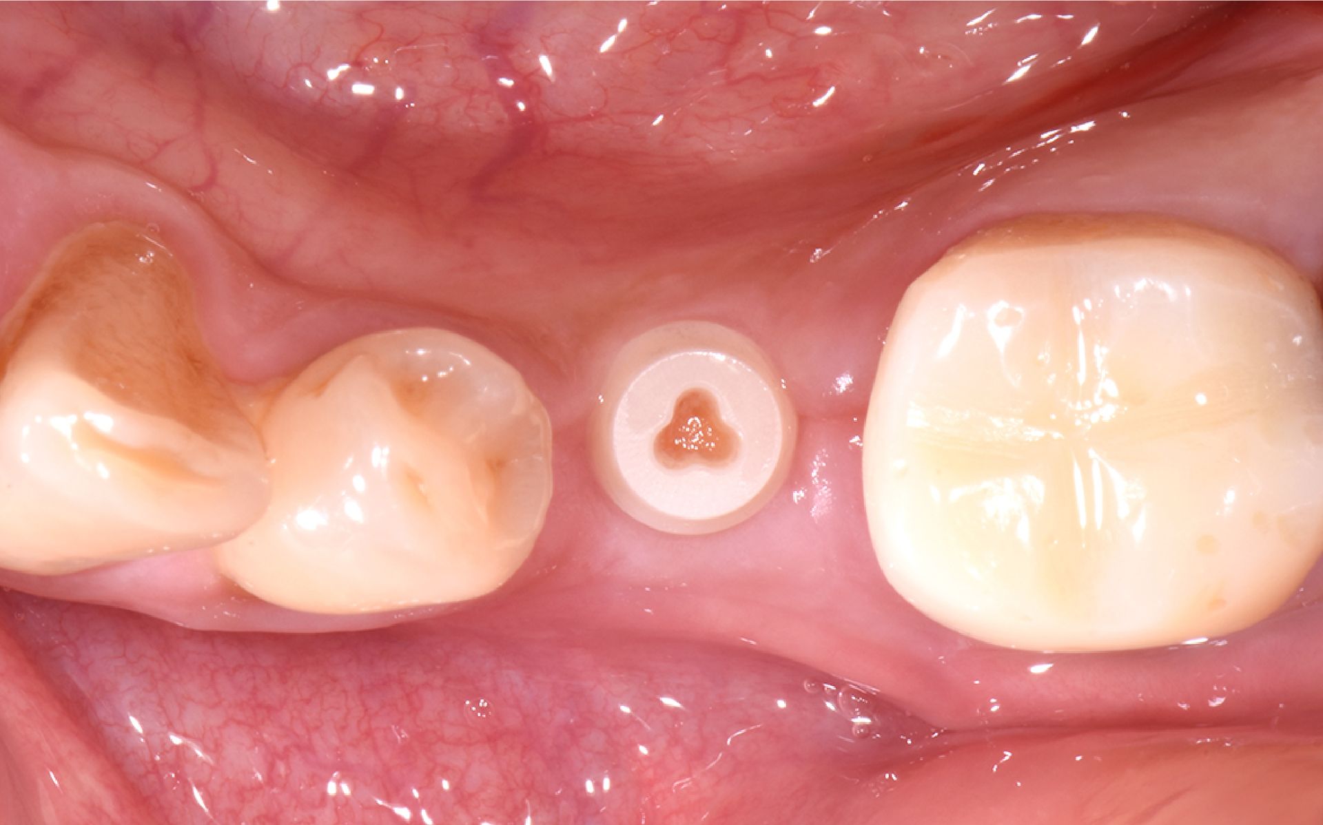 Tooth 35 was extracted. 8 weeks later, a symbionic tooth was placed. 4.5 years post-insertion, the site showed stable, healthy soft tissue and shallow probing depths.
